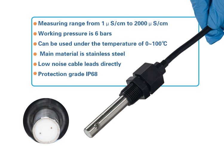 1. Use 2-electrode measuring method and the K value is 1.0, the conductivity electrode realizes the measuring range from 1μS/cm to 2000μS/cm